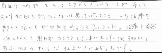 集中的に治療していただき長期間かかるだろうと覚悟していたのでとてもたすかりました。