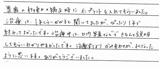 長期間に渡って、院長先生はじめとして、スタッフの皆さまには大変お世話になりありがとうございました。細かい要望などにも親切に対応頂いたので安心して通院治療することができました。また定期検診に来ますので、宜しくお願いします。