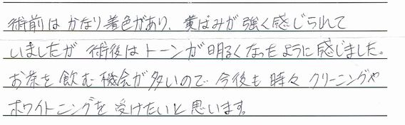もともと歯が黄いろいのが気になっていたので他の治療と一緒にこの際うけてみようと思いました。とても気持ちよく、ついうとうと(ほんとにすみません 汗)してしまい、いつのまにかきれいになっていたのでビックリです。ありがとうございました。