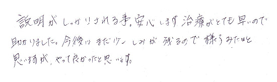 説明がしっかりされる事。安心しますが治療がとても早いので助かりました。今後はまだ少ししみが残るので様子みたいと思いますが、やって良かったと思います。